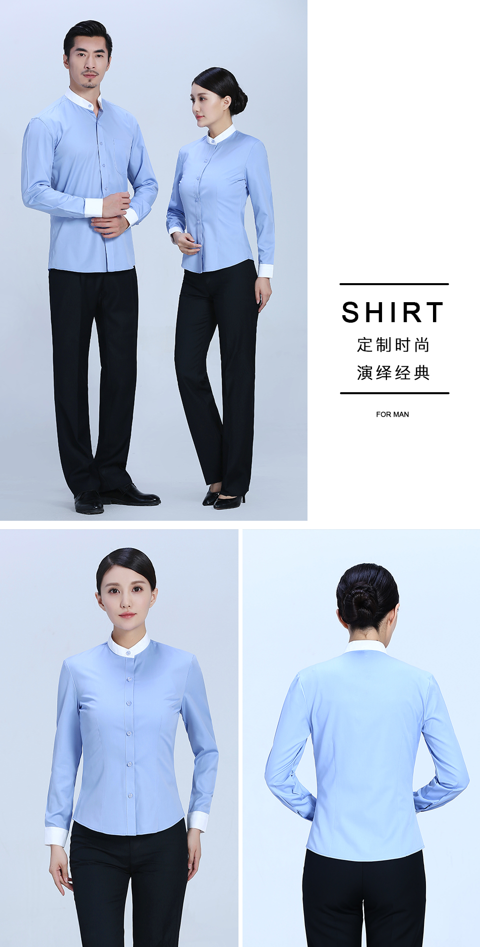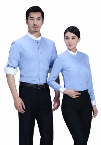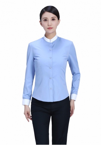 立领蓝色拼色长袖衬衫