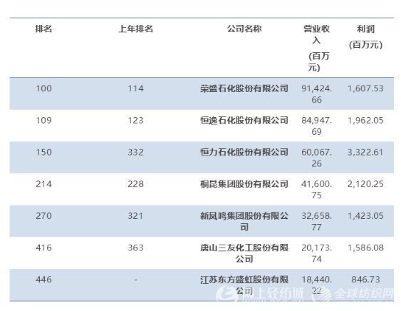 财富中文网发布了较新的《财富》中国500强排行榜,考量了全球范围内较大的中国上市企业在过去一年的业绩和成就。值得关注的是,入围2019中国500强排行榜的化纤纺织企业共有7家。其中,荣盛石化股份有限公司排名较为靠前,为第100位;江苏东方盛虹股份有限公司是首次入榜。